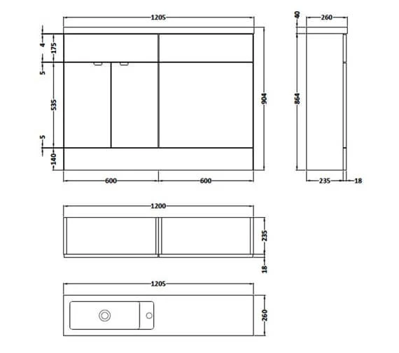 - Overall Size: Width 1205 x Depth 260 x Height 904mm.
