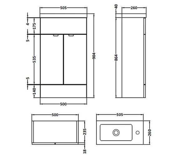 - Overall size: Width 505 x Depth: 260 x Height 904mm.