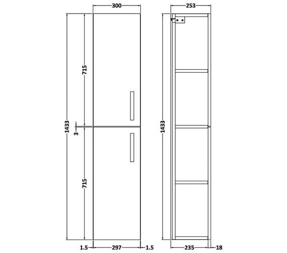 - Size: Width 300mm x Depth 253mm x Height 1433mm.