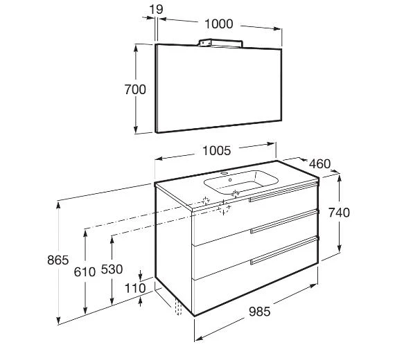 The Roca Victoria-N Vanity Unit Pack is a fine combination of Vanity, Mirror and Basin. The base vanity unit has a fabulous square design for installation in well-appointed bathrooms. The compact, modern design extends storage space within the 3 soft close drawers. The integral basin has a vitreous china construction and allows a generous fill and a refreshing wash. Its rectangular form lends it an easy and flexible approach to installation. The high quality ceramic of this durable basin is enhanced by a crisp white finish. It is supplied with a well-coordinated wall hung a mirror for clear images aiding in daily grooming.